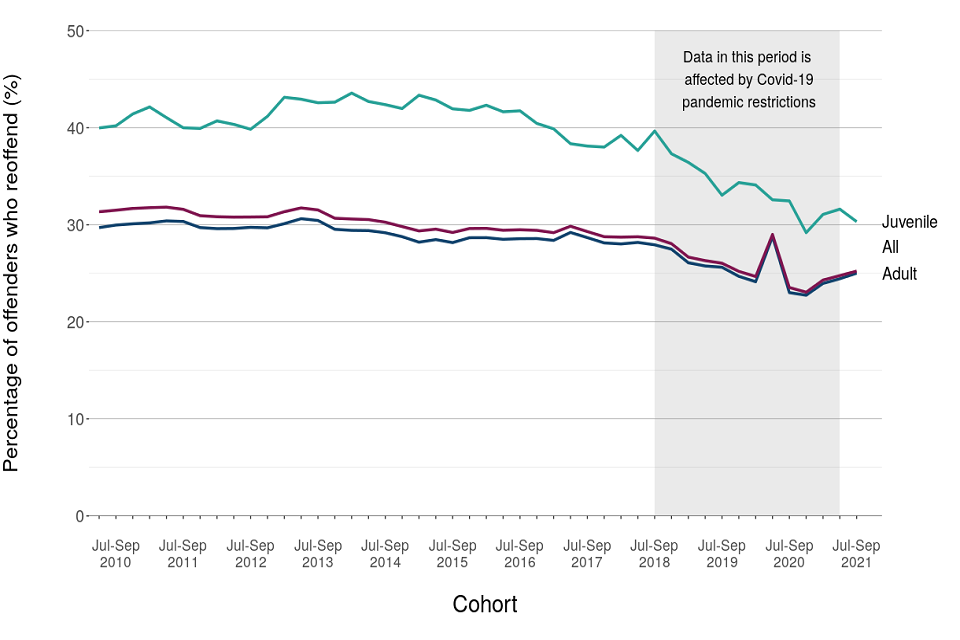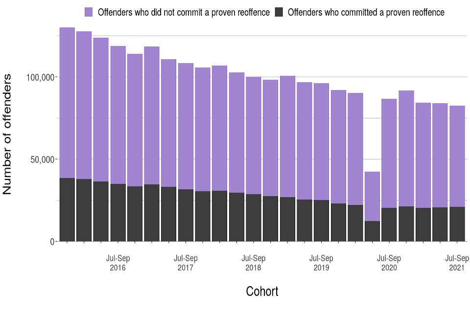 “Figures presented in this statistical release show proven reoffending statistics for the July to September 2021 offender cohort. Proven reoffences are measured over a one-year follow-up period and a further six-month waiting period to allow for offences to be proven in court.