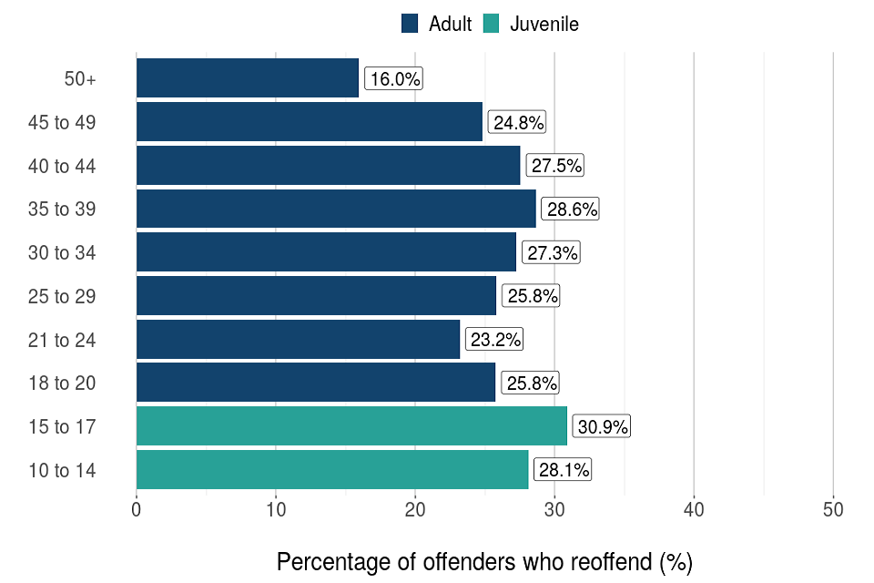 Offenders with 11 or more previous offences[footnote 8] had the highest rate of reoffending (41.4% for adults and 65.0% for juveniles).