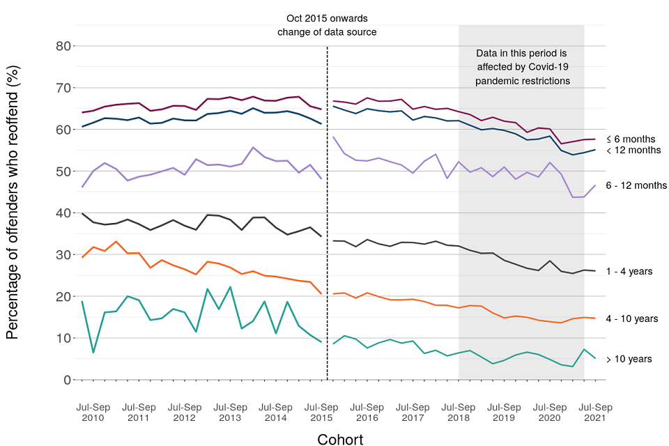 This publication provides the proven reoffending results for the July to September 2021 offender cohort, alongside historical data from 2010 onwards. This is the first post-pandemic cohort to not overlap with any Covid-related lockdowns or other operational restrictions. However, it is still affected by the continued recovery of the courts system, particularly around continued delays in the processing of court cases.