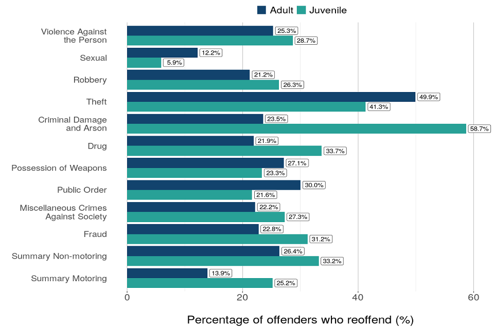 For adult offenders, the highest reoffending rate of 49.9% was for those with an index offence of theft. For juvenile offenders, the highest reoffending rate of 58.7% was for those with an index offence of criminal damage and arson (figure 8).