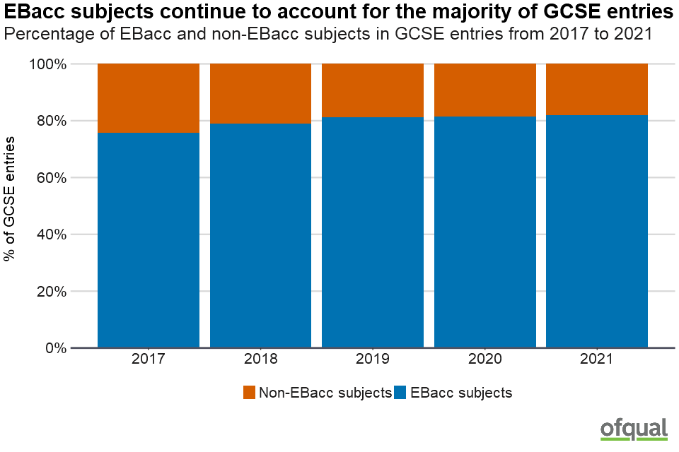 A bar chart showing the percentage of EBacc and non-EBacc subjects in GCSE entries from 2017 to 2021. EBacc subjects continue to account for the majority of GCSE entries. Further details are listed under the heading "GCSE entries".