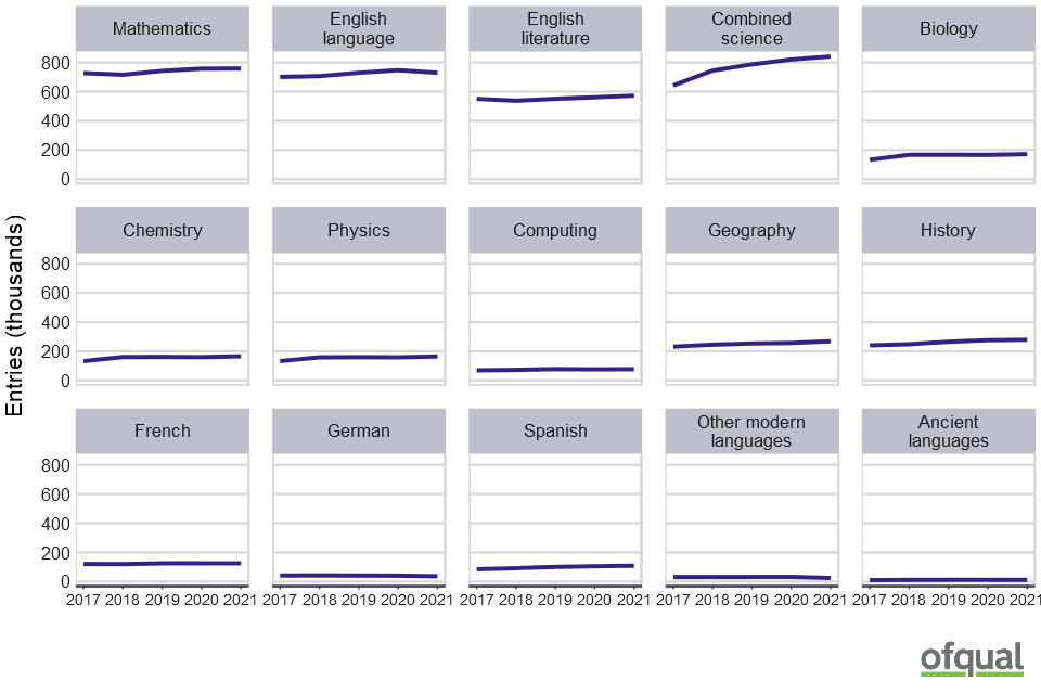 The graph and table below show the change in entries this year compared to 2020. The subjects are ordered by total entry size in 2021 (largest to smallest).