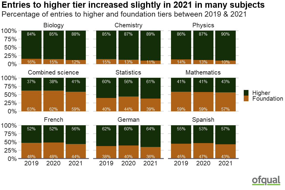 - There are small increases in the proportion of entries for the higher tier in most tiered GCSEs.