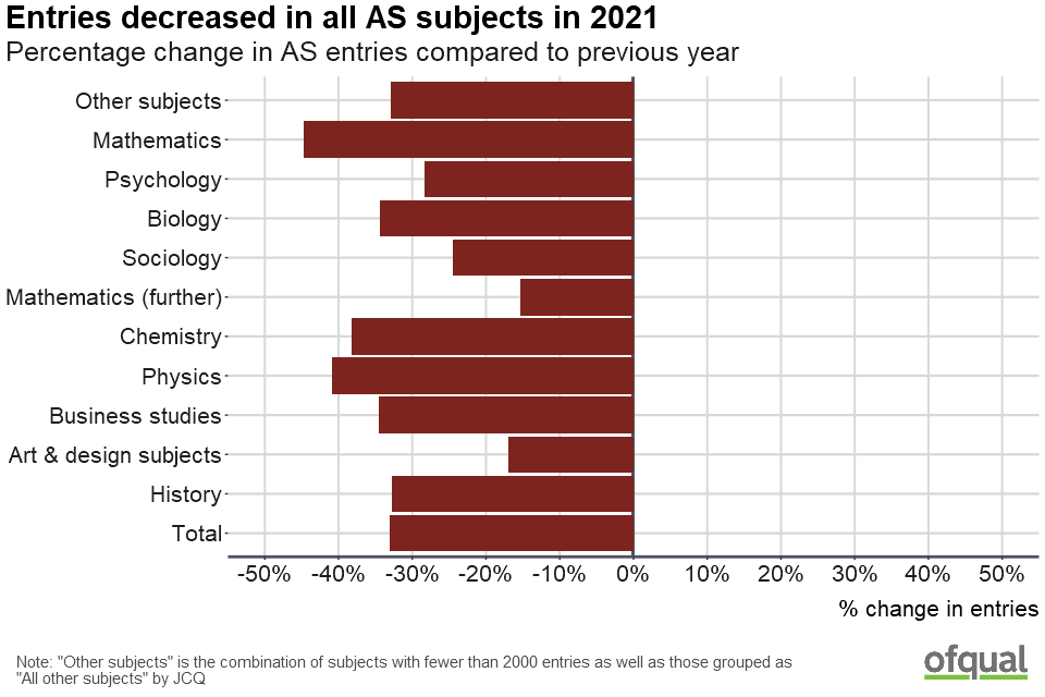 A diverging bar chart showing the percentage change in AS entries compared to previous year. Entries decreased in all AS subjects in 2021. Further details are listed under the heading "AS entries".