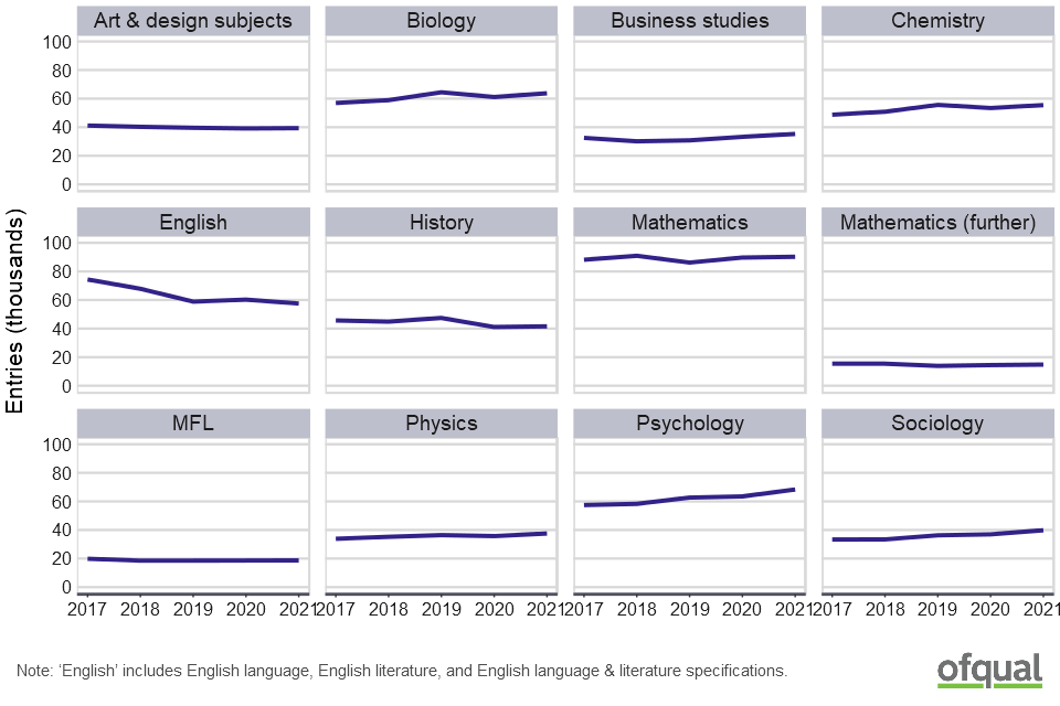 The graphs below show the change in entries from 2017 to 2021 for a selection of A level subjects in 2021. Entries for social science subjects continue to increase.