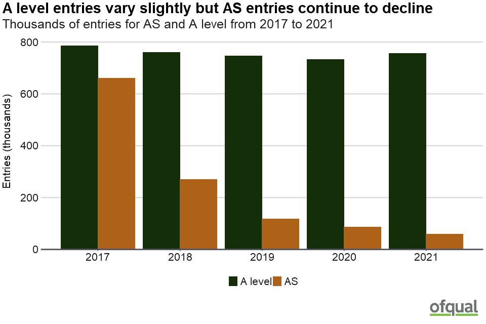A bar chart showing the thousands of entries for AS and A level from 2017 to 2021. A level entries vary slightly but AS entries continue to decline. Further details are listed under the heading "AS and A level entries".