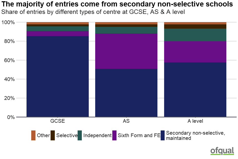 A bar chart showing the share of entries by different types of centre at GCSE, AS & A level. The majority of entries come from secondary non-selective schools. Further details are listed under the heading "Entries by centre type".
