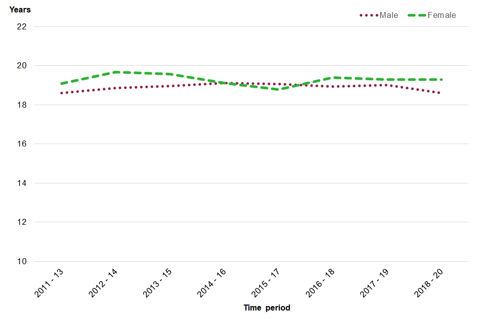 The difference in healthy life expectancy at birth between the most and least deprived areas in England was 18.6 years for males and 19.3 years for females in 2018 to 2020 (see Figure 1). There was no significant change in inequality for either sex compared with the previous period, and the inequality in healthy life expectancy at birth for England remained stable between 2011 to 2013 and 2018 to 2020.