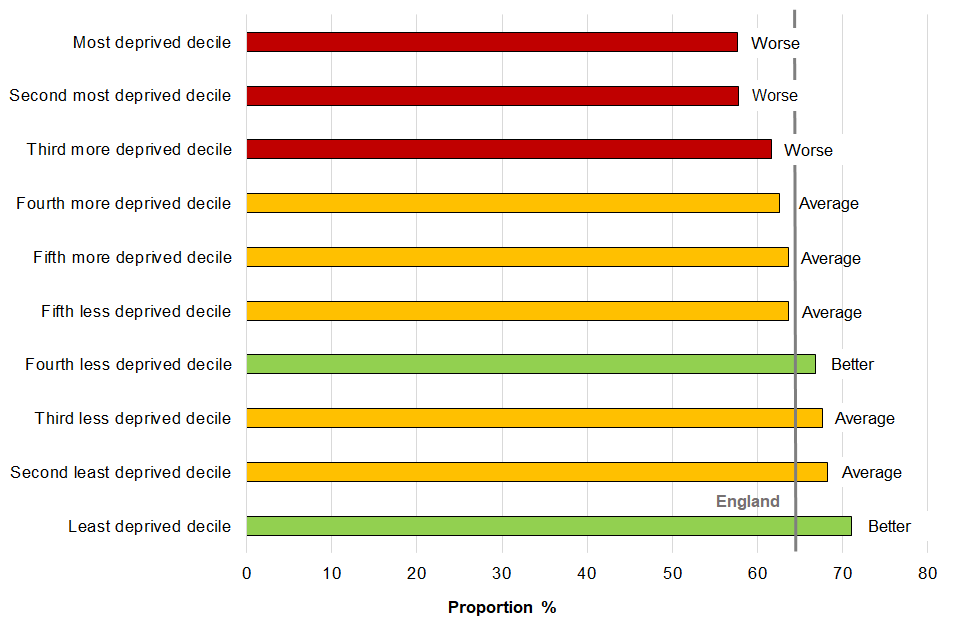 For people with long-term conditions there is a strong inequality gradient with 71.1% of people with long-term conditions being in employment in the least deprived decile of counties and unitary authorities, compared with 57.7% in the most deprived decile (see Figure 3).