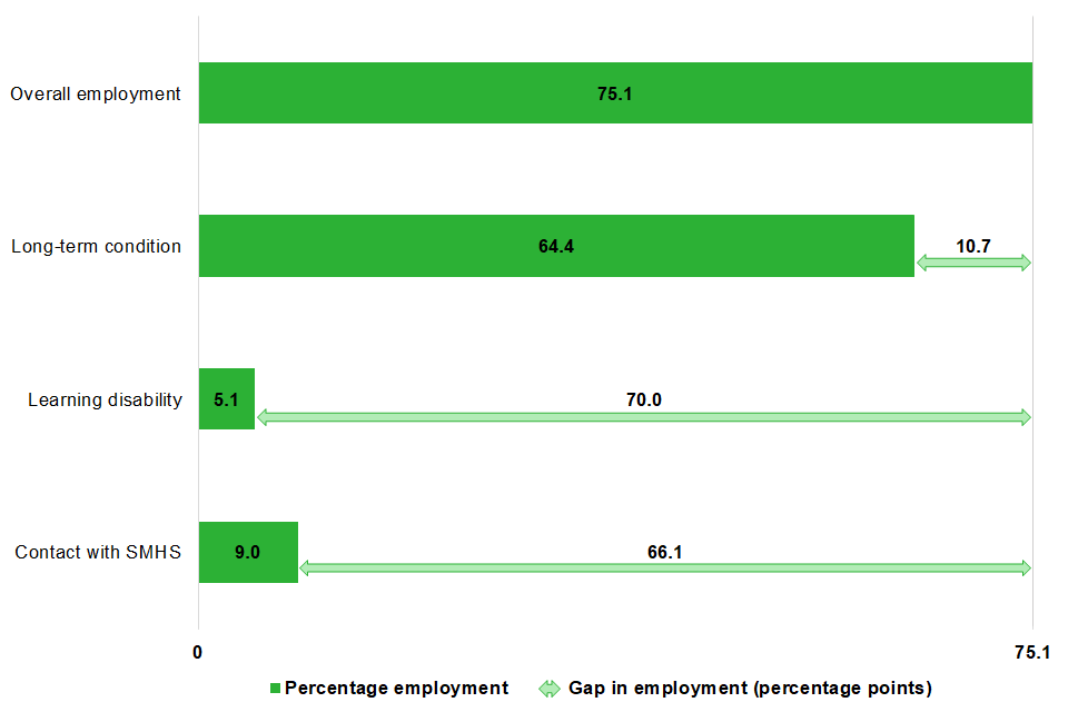 People in England with a physical or mental long-term health condition have a higher estimated employment rate at 64.4% than people with long-term support for a learning disability (5.1%), and people in contact with secondary mental health services under the Care Plan Approach (9.0%).