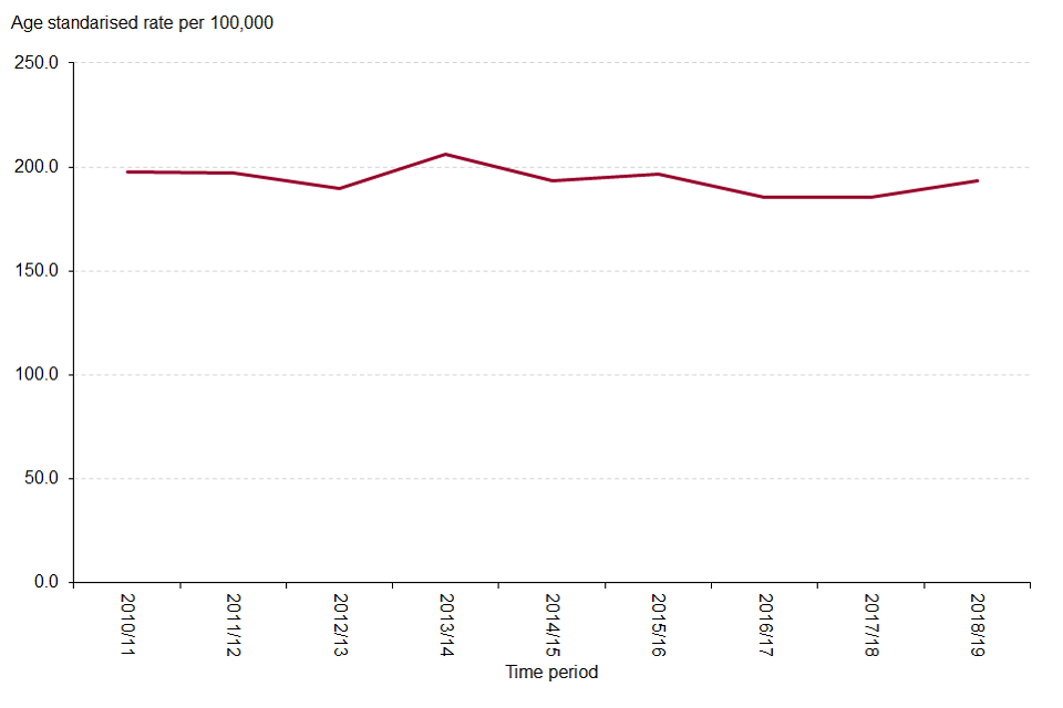 The emergency admission rate in England for intentional self-harm was 193.4 per 100,000 population in the financial year 2018 to 2019 (108,803 emergency admissions), a significant increase on the previous period. The rate has stayed relatively consistent since the financial year 2010 to 2011 with a peak value of 205.9 in 2013 to 2014 and a minimum of 185.3 in 2016 to 2017.