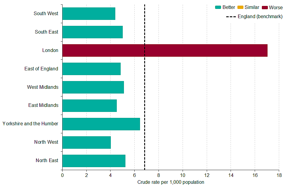 The crude rate of complaints about noise in England was 6.8 per 1,000 population in 2018 to 2019. Noise complaints are significantly higher in London compared with other regions across England. The value for London was 17.0 per 1,000 population, the next highest region was Yorkshire and the Humber at 6.4 per 1,000 (figure 1).