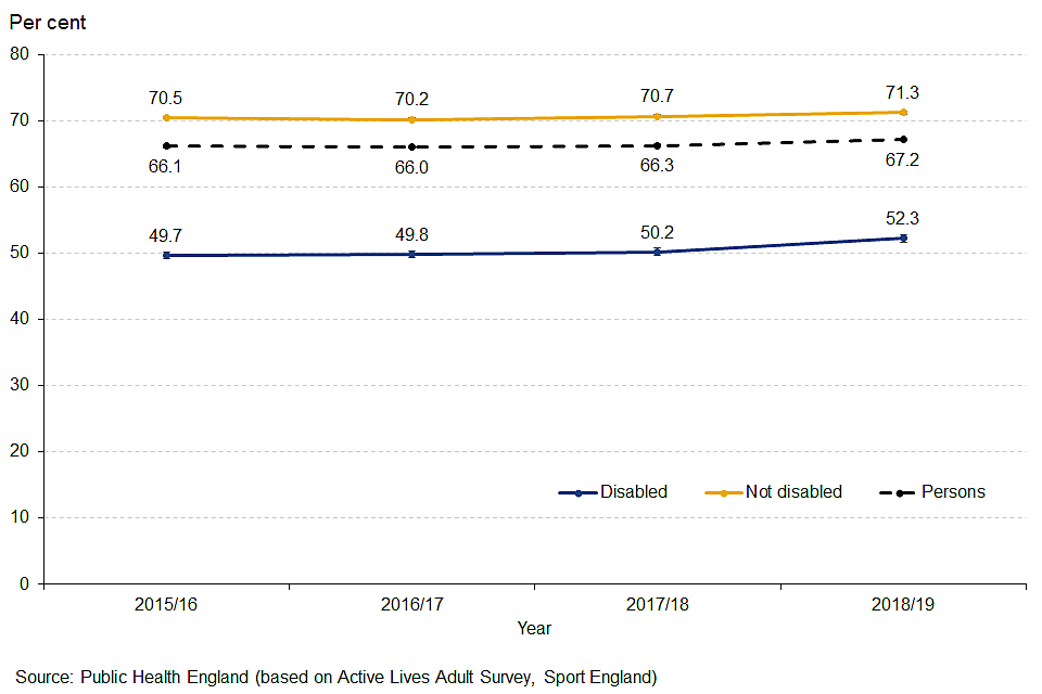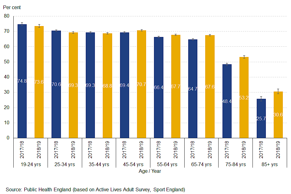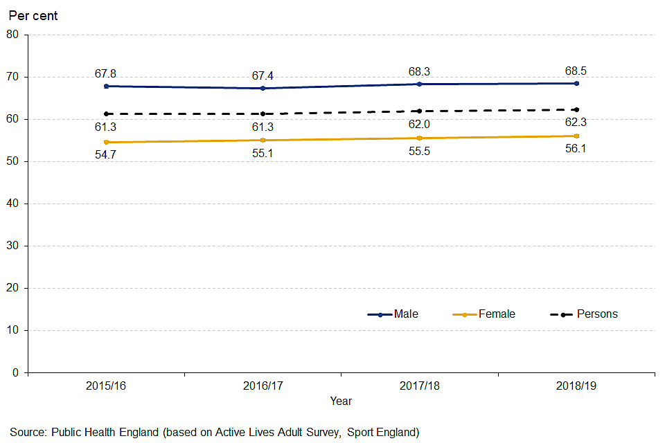 In 2018 to 2019 the percentage of physically active adults (those completing at least 150 minutes of moderate intensity physical activity a week) increased from 66.3% in 2017 to 2018 to 67.2%. In 2018 to 2019, estimates of physically active adults among local authority districts and unitary authorities in England ranged from 46.7% to 82.0%.