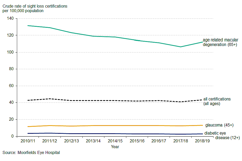 The latest data are for 2018 to 2019, measured as a crude rate of new certifications per 100,000 population. The rate shows an increase compared with the previous time period for both sight loss due to age related macular degeneration (AMD) and the overall rate of new sight loss certifications (which includes both preventable and non-preventable causes of sight loss). Sight loss due to glaucoma and diabetic eye disease did not change significantly.