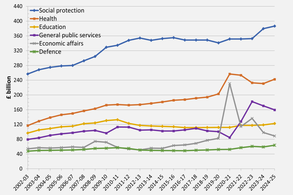 Real terms figures are the nominal figures adjusted to 2024-25 price levels using GDP deflators from the Office for National Statistics (released 6 January 2026).