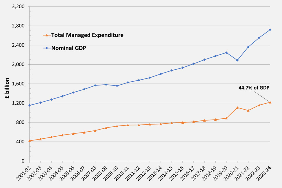 - TME as a percentage of GDP, which shows the size of the public sector relative to the size of the whole economy, was 44.7 per cent in 2023-24. This has fallen from 45.3 per cent in 2022-23.