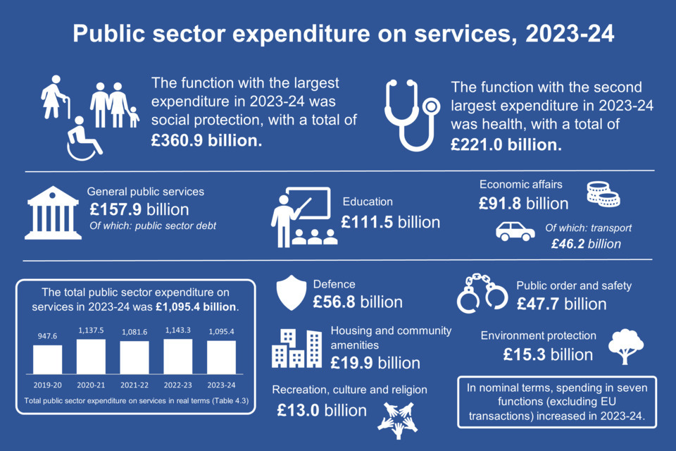 - The tables in chapter 5 of this release present analysis of total public sector expenditure on services split by function, sub-function and economic category.