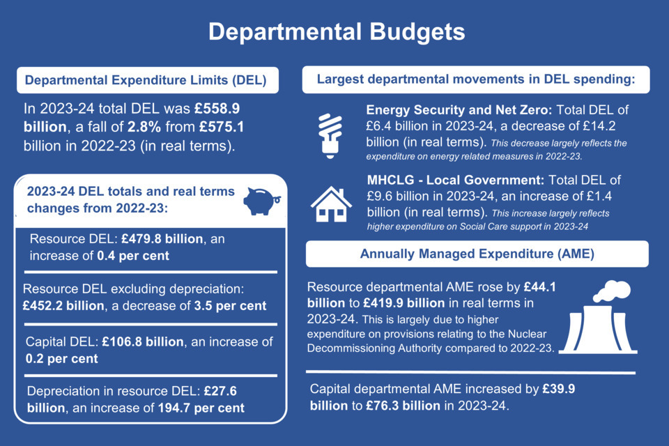 - Total resource DEL was £479.8 billion in 2023-24, compared to £449.9 billion in 2022-23, in nominal terms.