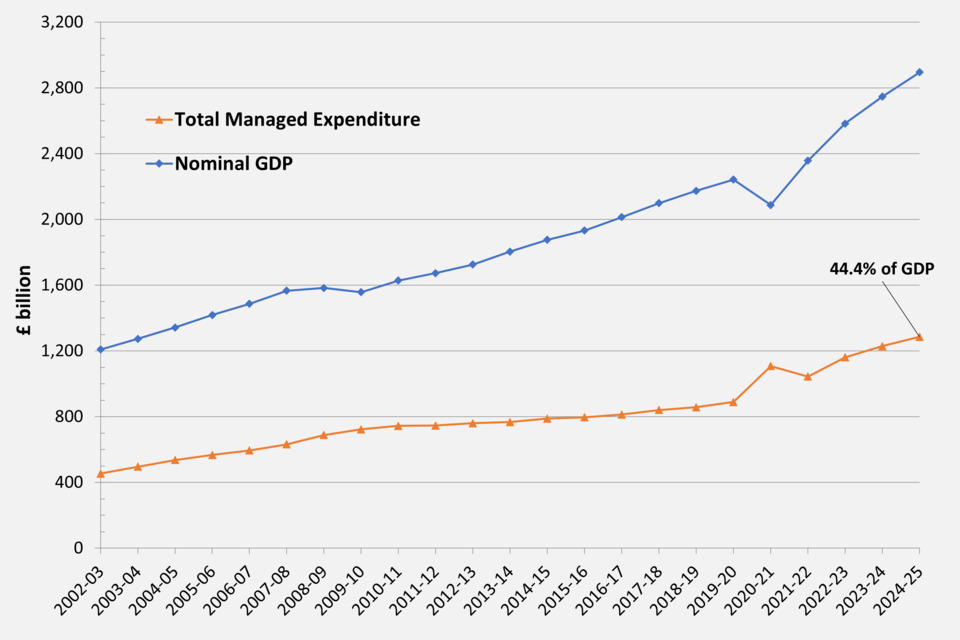 - TME as a percentage of GDP, which shows the size of the public sector relative to the size of the whole economy, was 44.4 per cent in 2024-25. This has fallen from 44.7 per cent in 2023-24.