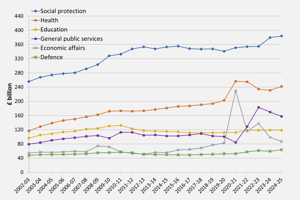 - Spending on administration, composed mainly of pay and procurement, stood at £13.0 billion in 2024-25. This is a rise of 2.2 per cent from the previous year.
