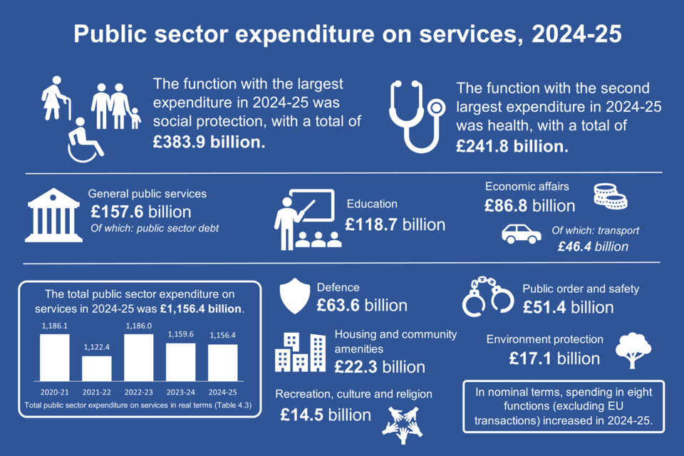 - The tables in chapter 5 of this release present analysis of total public sector expenditure on services split by function, sub-function and economic category.