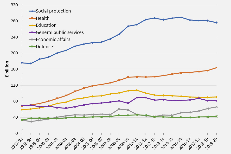 - spending on Social Protection was £276.1 billion in 2019-20, down from £281.0 billion in the previous year