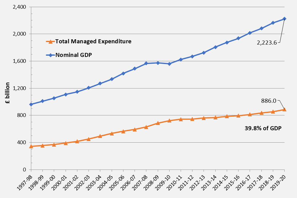 - during the recession, as GDP shrank but spending increased, TME took an increasingly large share of national income. As a result, TME as a percentage of GDP peaked at 46.3 per cent in 2009-10. In 2019-20 it stood at 39.8 per cent of GDP (Table 10b).