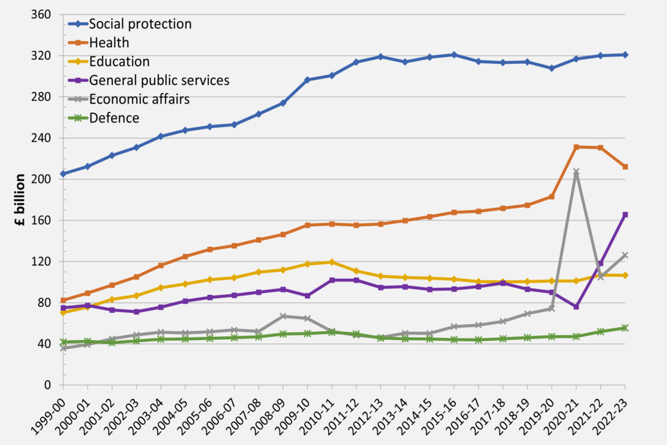 Real terms figures are the nominal figures adjusted to 2022-23 price levels using GDP deflators from the Office for National Statistics (released 29 September 2023).