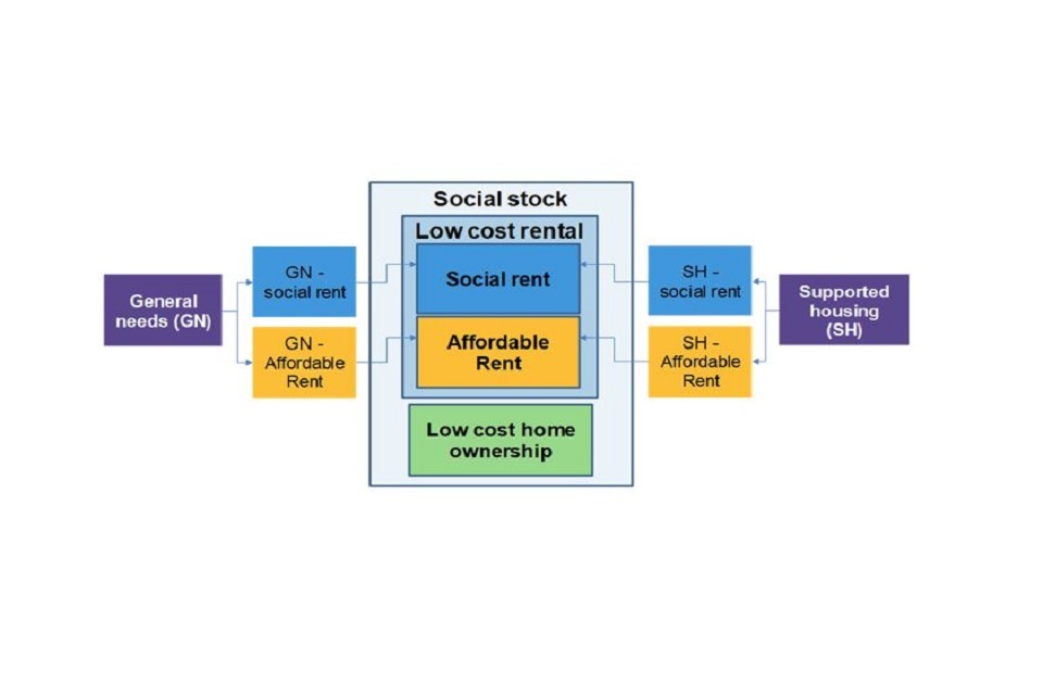 The graphic below shows the types of unit included in each category used in the statistics. Social rent and Affordable Rent are both included in low cost rental figures. In the statistics the term ‘social rent’ is used for all low cost rental units which are not defined as Affordable Rent. This is in line with common usage of the term ‘social rent’ and means that ‘social rent’ units will include some units excepted from the Rent Standard.