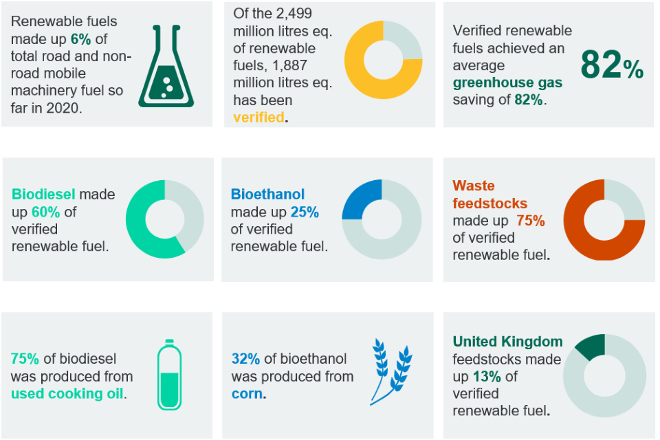 Of the 1,887 million litres eq. of renewable fuel verified so far in 2020, biodiesel comprised 60% of supply, and bioethanol 25%. There were also small amounts of other renewable fuels including biomethanol, biomethane, off-road biodiesel and biopropane.