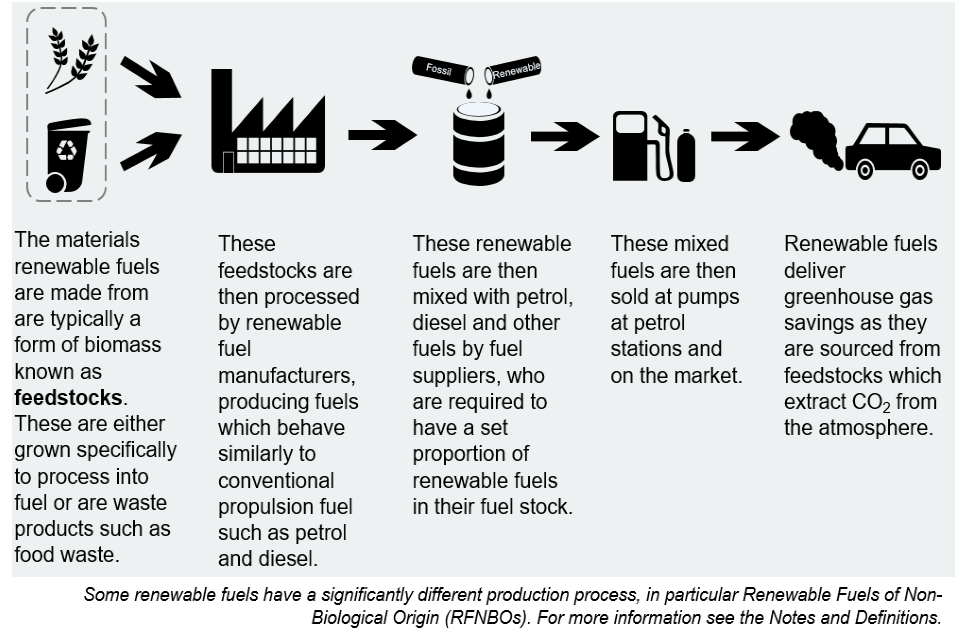 Renewable fuels are produced from biomass or some other renewable energy source. They are often blended with conventional fuels such as petrol or diesel, but they produce lower greenhouse gas emissions as their energy is from renewable sources.