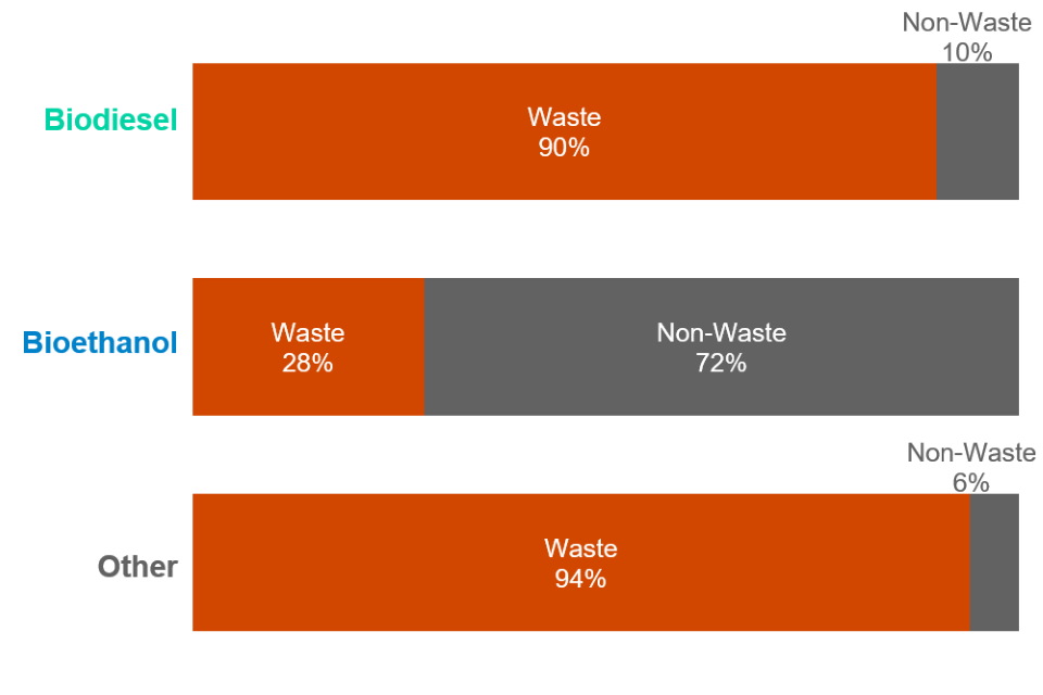 This chart shows the breakdown of waste and non-waste feedstocks by fuel type.