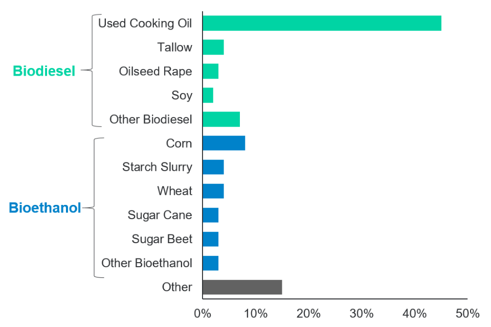 The majority (52%) of all verified renewable fuel was produced from used cooking oil (UCO), which is used in several different types of renewable fuel. UCO comprised 75% of biodiesel. For bioethanol, the most common feedstock was corn (32%). Corn-based bioethanol comprised 8% of total renewable fuel.