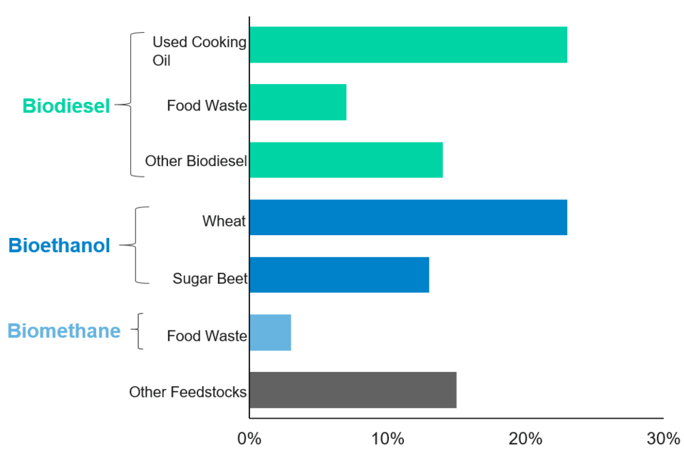 The most widely reported source for bioethanol supplied to the UK (by feedstock and country of origin) was corn from Ukraine (60 million litres, 3% of renewable fuel supplied, 13% of total biodiesel supplied).