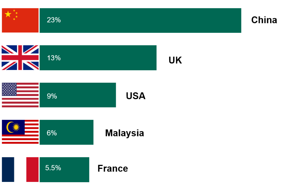 This chart shows the top 5 countries supplying verified renewable fuel to the UK. China – 23%; UK – 13%; USA – 9%; Malaysia – 6%; France – 5.5%
