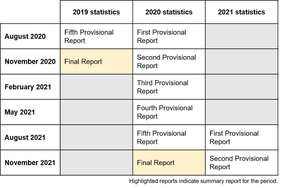 Last publication - February 2021 - 2020 Third provisional report. This publication - May 2021 - 2020 Fourth provisional report. Next publication – August 2021 - 2020 Fifth provisional report, 2021 First provisional report.