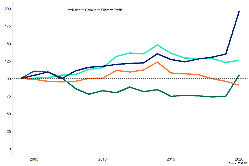 Table 1 and chart 1 show that pedal cycle traffic has risen between 2004 and 2020 faster than serious injuries whilst fatalities and slight injuries have fallen.