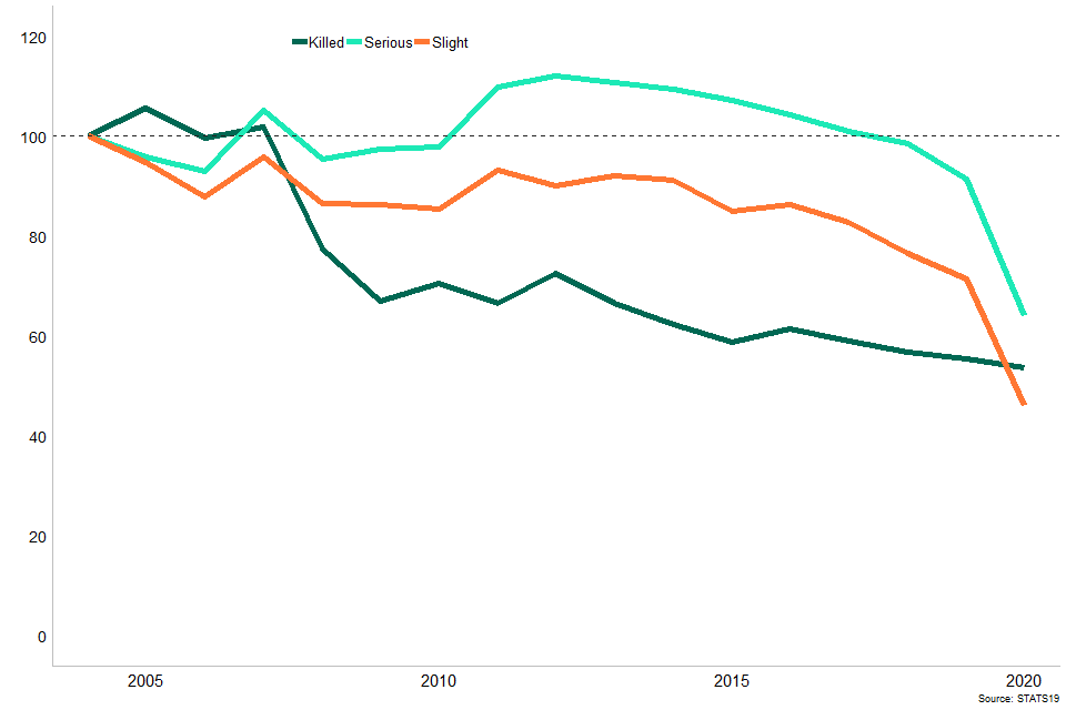 Data in this factsheet is from 2004 onwards. Serious and slight injuries have been adjusted to account for changes in the severity reporting systems. More information on the change and adjustment process is available in the Reported road casualties Great Britain, annual report 2020.
