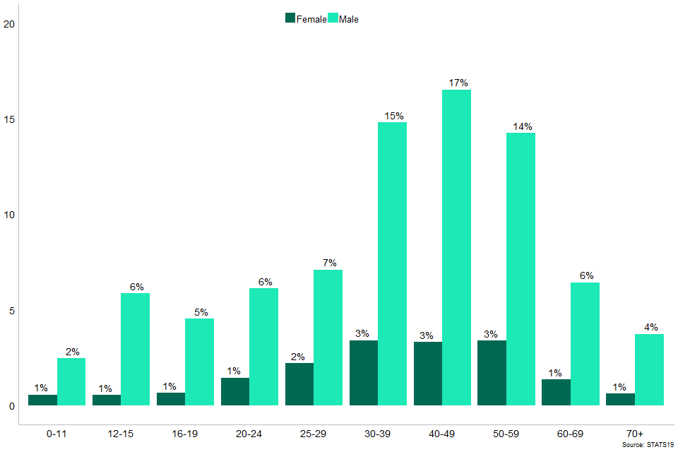 Between 2015 and 2020, 83% of pedal cycle casualties were male and 17% female.