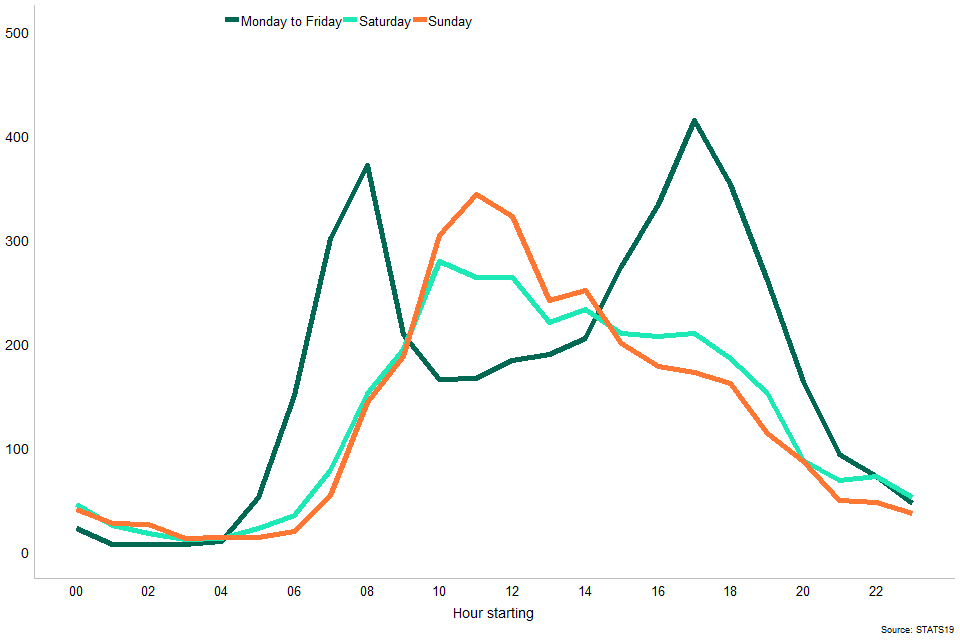 The weekday peak time for pedal cyclist KSIs is from 7am to 10am and from 4pm to 7pm. By contrast, the pattern differs markedly for Saturday and Sunday for both trips and KSIs. During the weekend there is a single peak around mid-morning (10 am to 12 noon) which gradually tails off during the afternoon and evening
