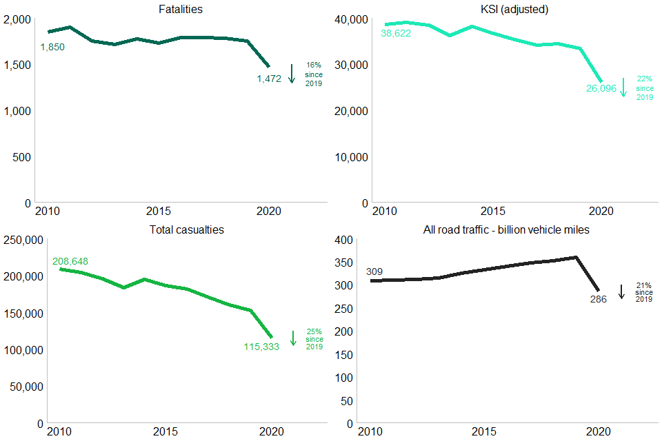 The summary table below shows the number of reported road casualties in Great Britain in 2020 compared with 2019 and 2010.