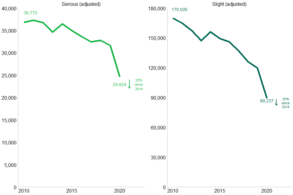 Our best estimate, after adjusting for changes in reporting by police, is that there were 22,014 seriously injured and 91,847 slightly injured casualties, decreases of 22% and 25% since 2019, respectively.