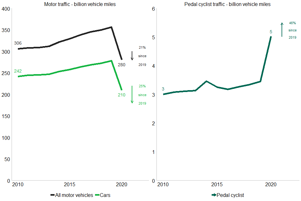 In 2020, there was a shift in travel behaviours due to the COVID-19 pandemic, which varied by transport mode. The National Travel Attitudes Study reported 79% of survey respondents used buses less when comparing travel before and during the pandemic. For the same period, 34% of pre-pandemic cyclists reported they were cycling more. Further details can be found in the National Travel Attitudes Study release.