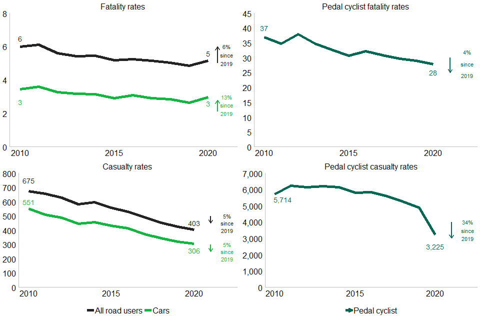 However, despite an increase in pedal cycle fatalities, there was a slight (4%) reduction in fatality rates for pedal cyclists and a much larger reduction in the pedal cycle casualty rate of 34% between 2019 and 2020 - as casualties did not increase by as much as cycle traffic (Chart 8).