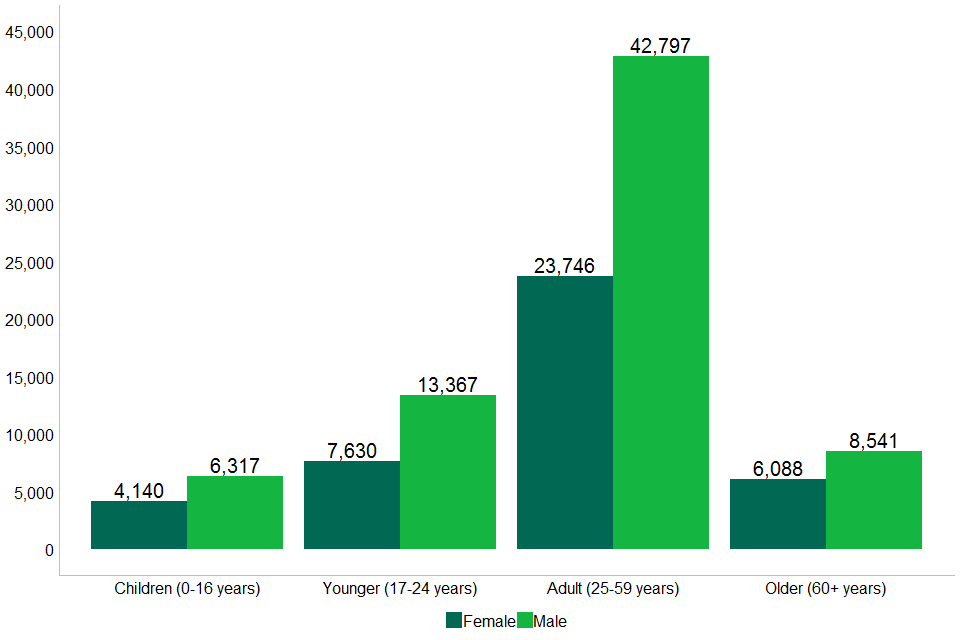 | Male | Younger casualties (17 to 24 years old) | 13,367 | -20 | -52 |