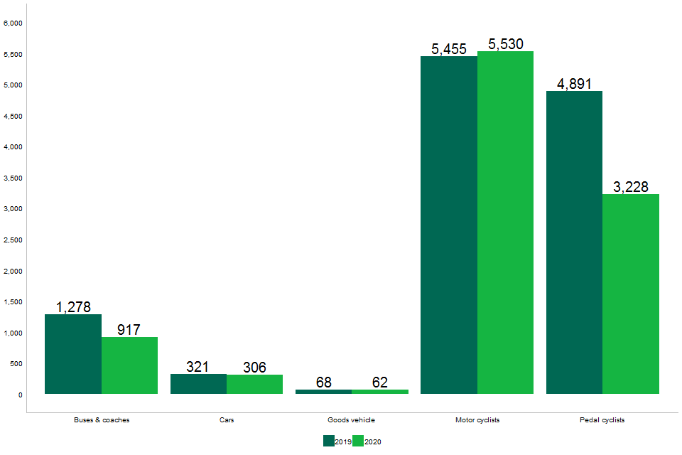 Pedal cyclist traffic increased by 46% in 2020 compared to 2019, whereas all motor vehicle traffic decreased by 21%. Compared to other road users, pedal cyclist casualty rates saw the greatest reduction of 34% (Chart 6). This may be as a result of reduced motor vehicle traffic and increased pedal cyclist traffic.