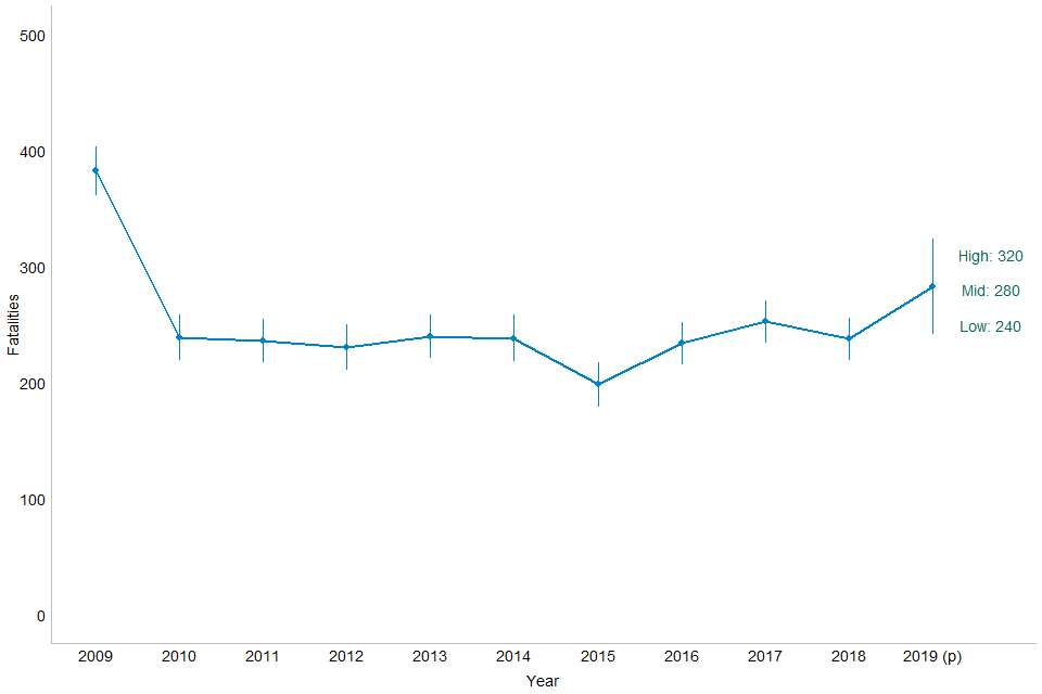 The provisional estimate of fatalities for 2019 is the highest since 2009. However, the rise from 240 in 2018 is not statistically significant.