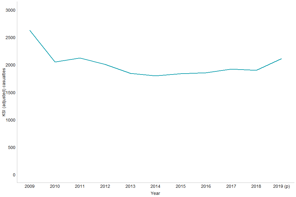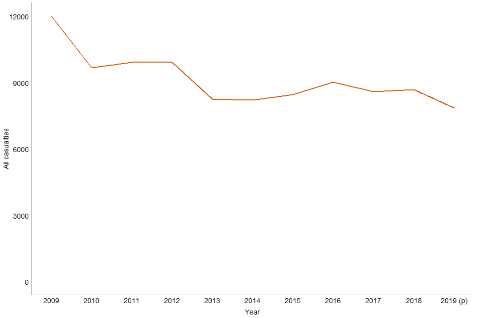Non-fatal casualties since 2016 have been affected by a large number of police forces changing their reporting systems which has had a large impact on the classification of injuries recorded. Further details are in the 2019 annual report.