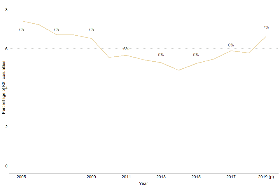 The proportion of killed or seriously injured (KSI adjusted) casualties in drink-drive accidents has varied between 5% and 7% since 2005. In 2019, the rate was 7%.