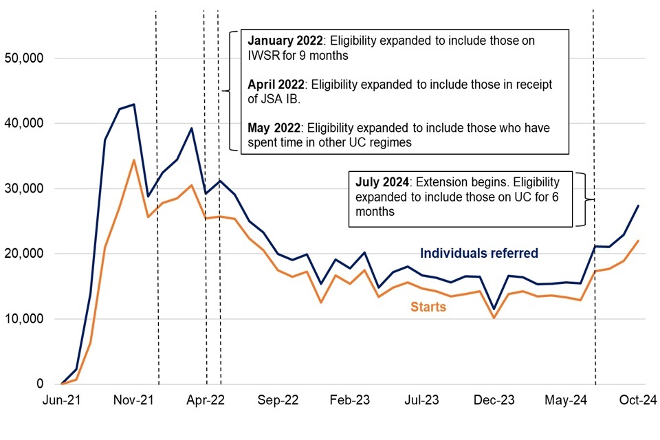 From January 2022, those in receipt of UC and in the IWS regime for at least 9 months were considered eligible; was expanded later in 2022 to include all claimants on UC and in the IWS regime with UC claims of at least 9 months, as well as those claimants in receipt of Income Based Jobseeker’s Allowance (JSA IB).